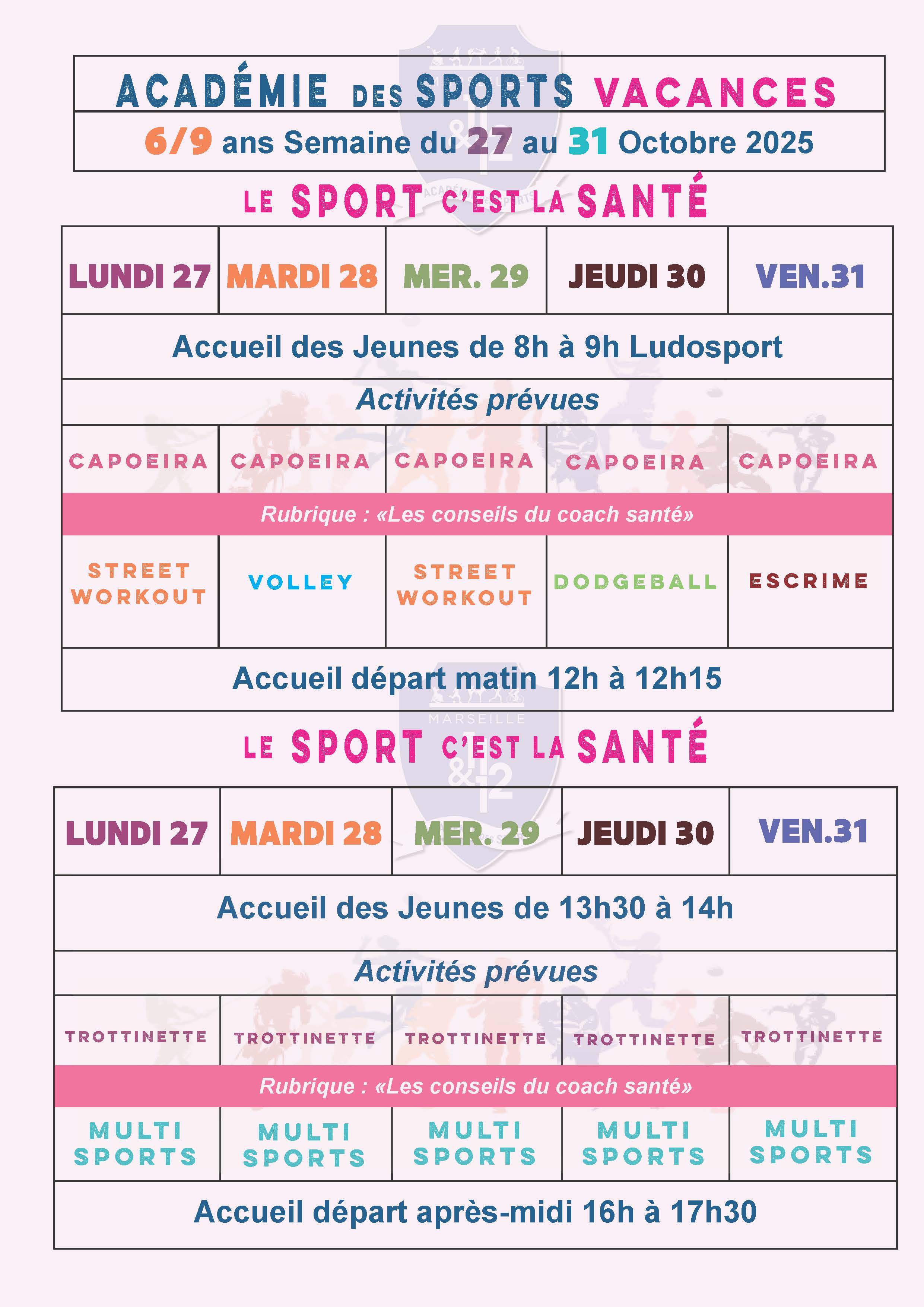 Attention la fiche est différente selon la tranche d'âge et la semaine (6/9 ans ou 10/14 ans).
