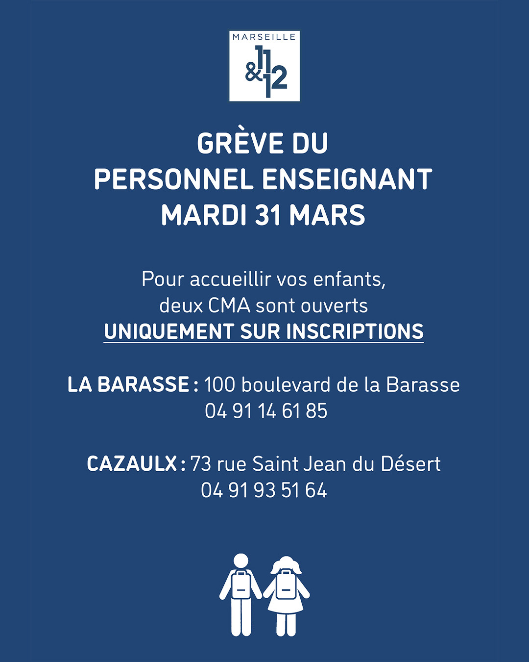 En vue du mouvement de grève du personnel enseignant ce mardi 31 mars, la Mairie des 11&12 ouvre deux Centres Municipaux d'Animation qui pourront accueillir vos enfants de 8h30 à 16h30 UNIQUEMENT SUR INSCRIPTIONS.