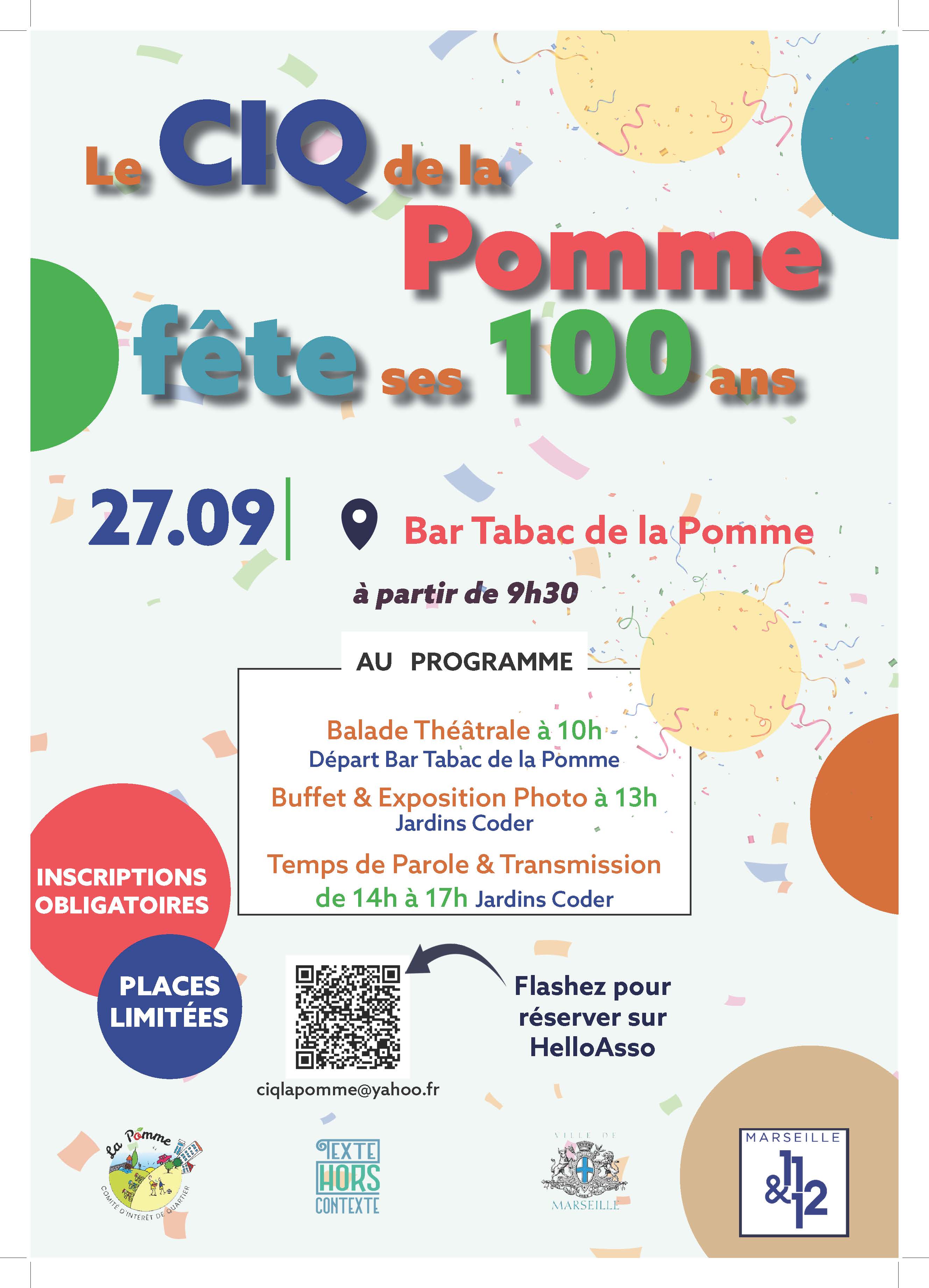Le CIQ La Pomme fête ses 100 ans ! Rendez-vous le samedi 27 septembre dès 9h30 au bar tabac de la Pomme (55 Avenue Emmanuel Allard) pour une journée de fête et d'animations.