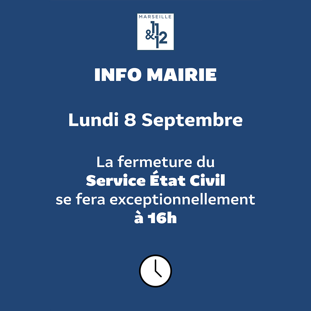 Submitted by ghaas@marseille.fr on ven 05/09/2025 - 16:55 Lundi 8 septembre : Fermeture exceptionnelle de l'état civil à 16h Exceptionnellement la fermeture du service État Civil de la Mairie des 11&12 se fera à 16h au lieu de 16h30 ce lundi 8 septembre.Merci de votre compréhension. 05/09/2025 Étiquettes Mairie Lieu Mairie des 11&12 Quartier Les Caillols