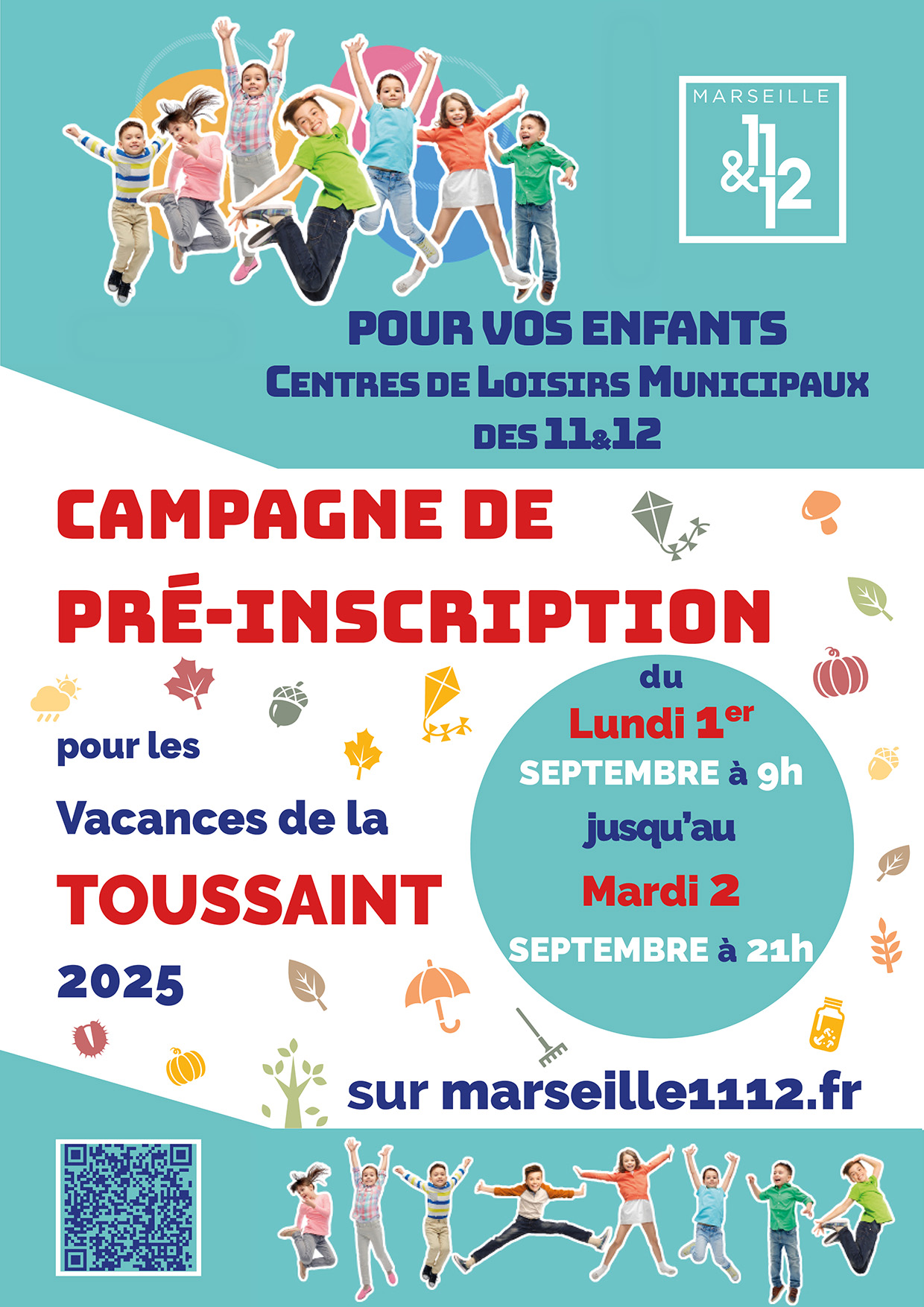 La campagne de pré-inscription aux Accueils Collectifs de Mineurs (ACM) municipaux de la Mairie des 11e et 12e arrondissements de Marseille pour les vacances de la Toussaint (du 18 octobre au 3 novembre) aura lieu du lundi 1er septembre à 9h au mardi 2 septembre à 21h sur marseille1112.fr