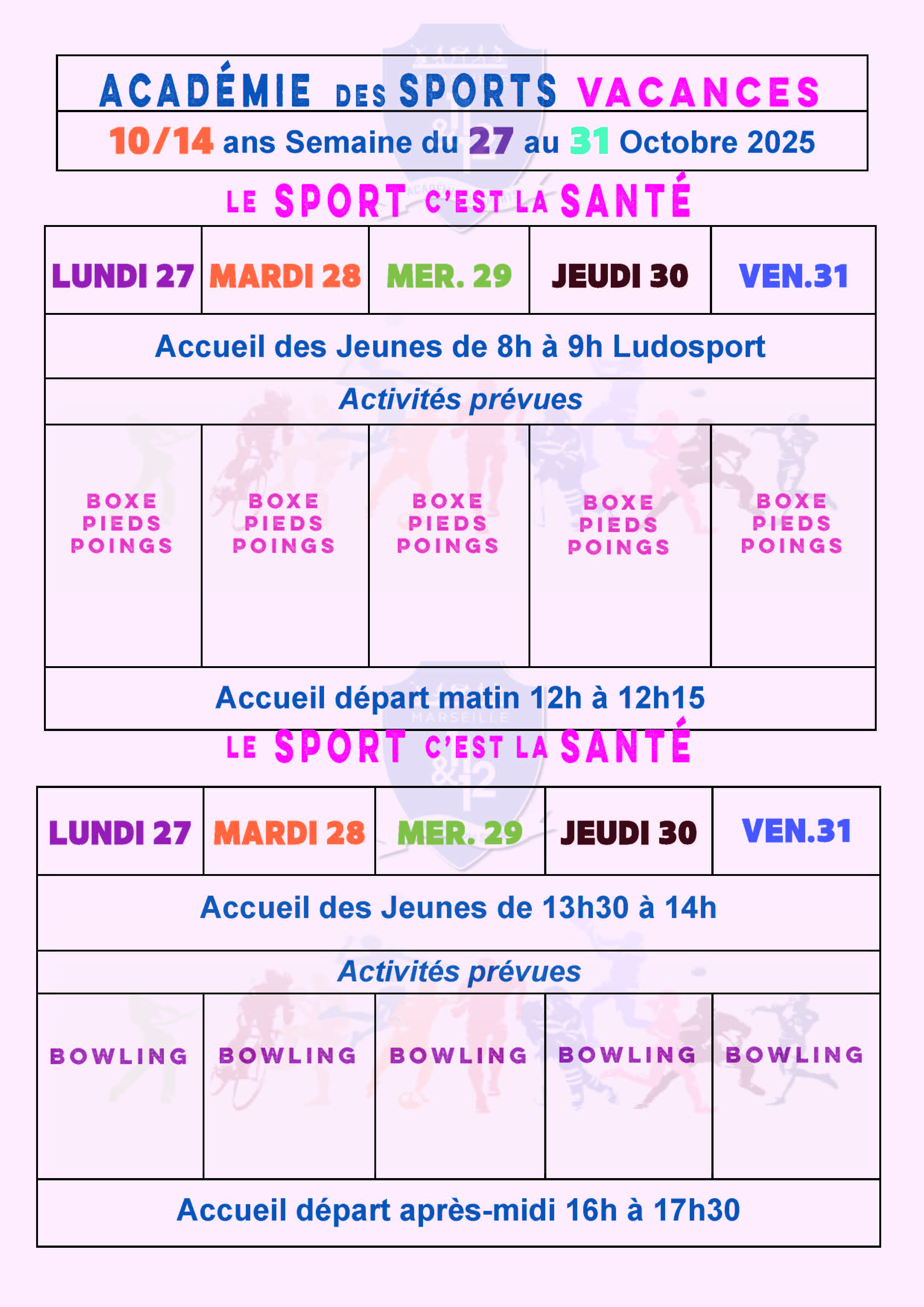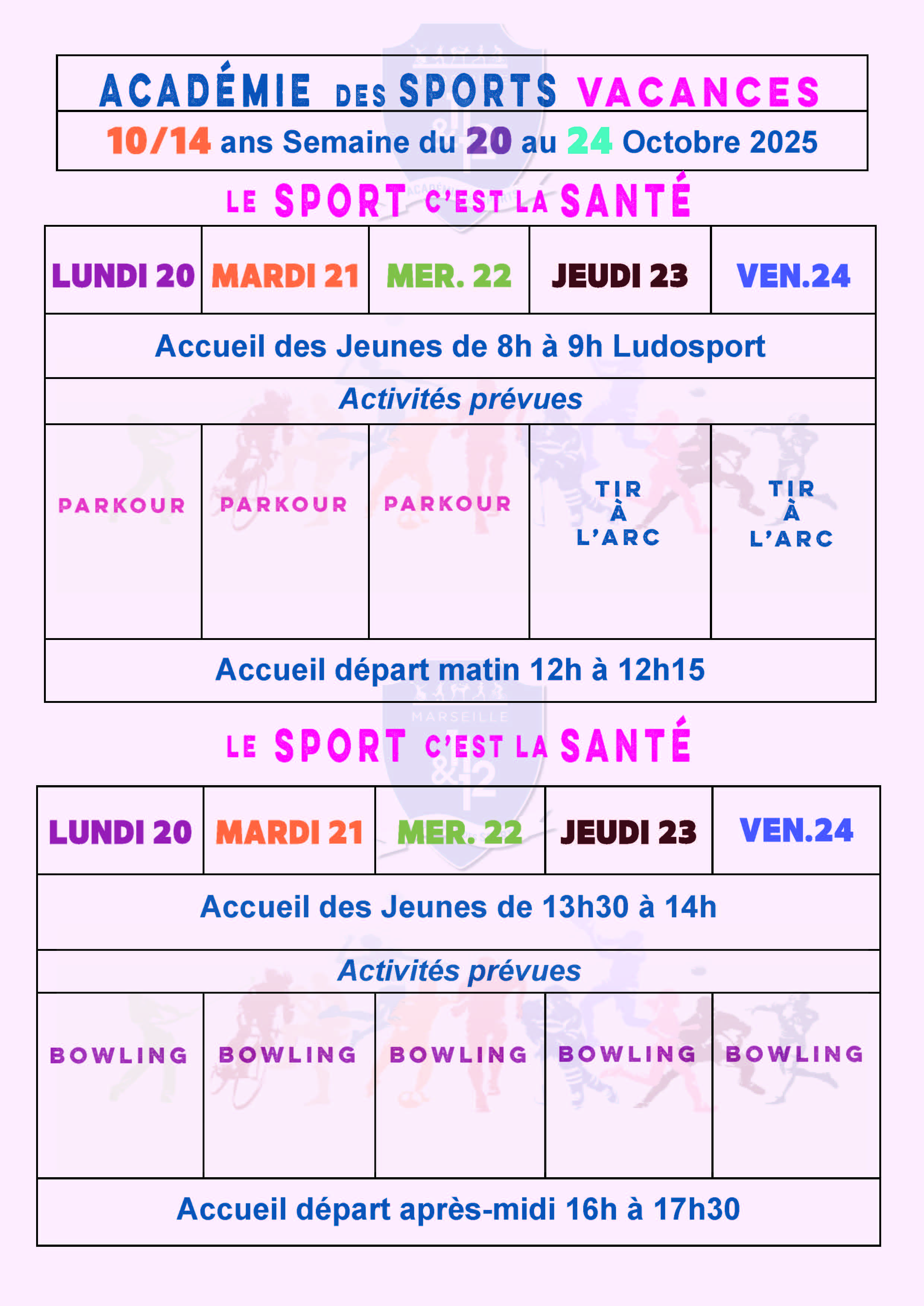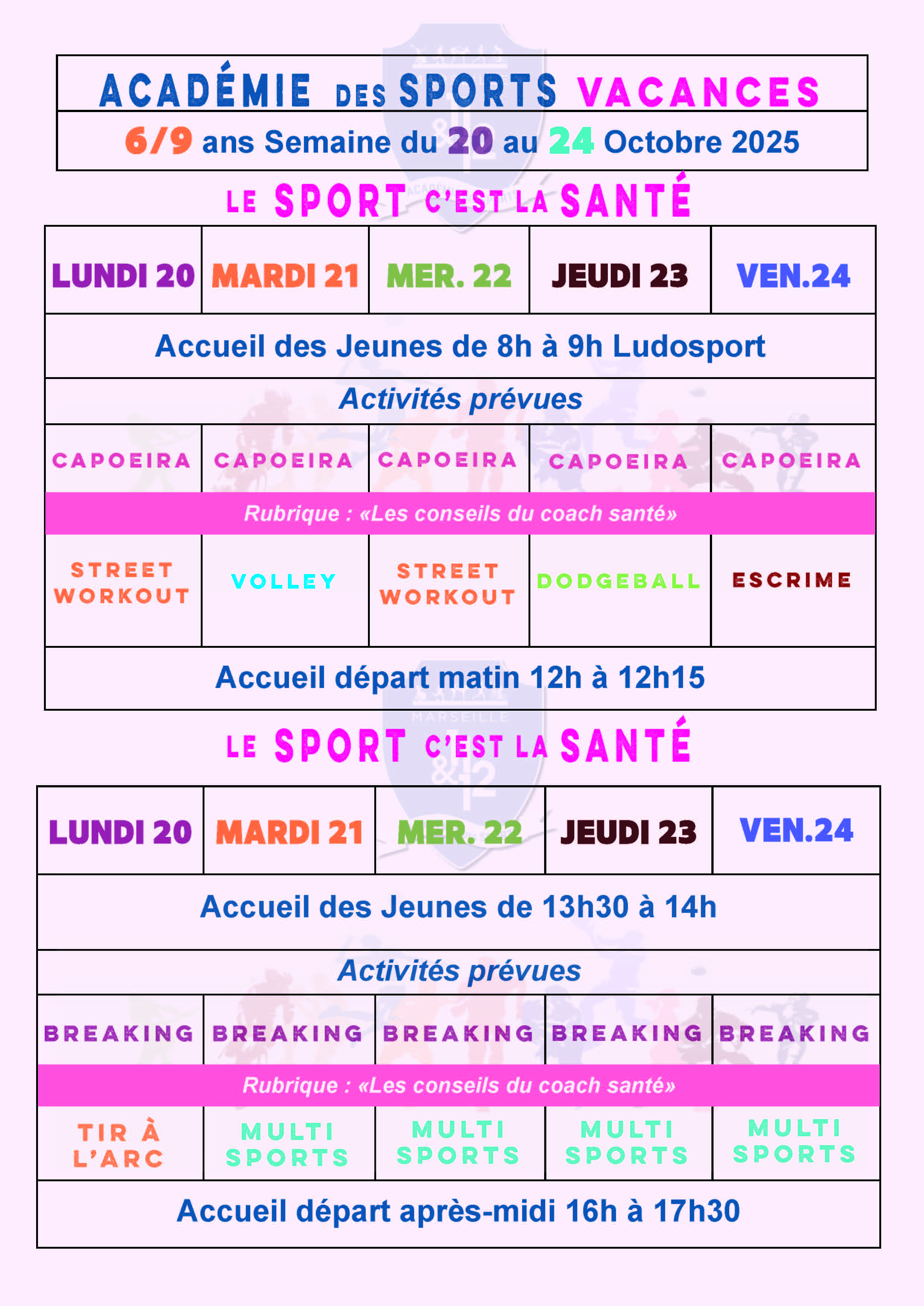 Attention la fiche est différente selon la tranche d'âge et la semaine (6/9 ans ou 10/14 ans).