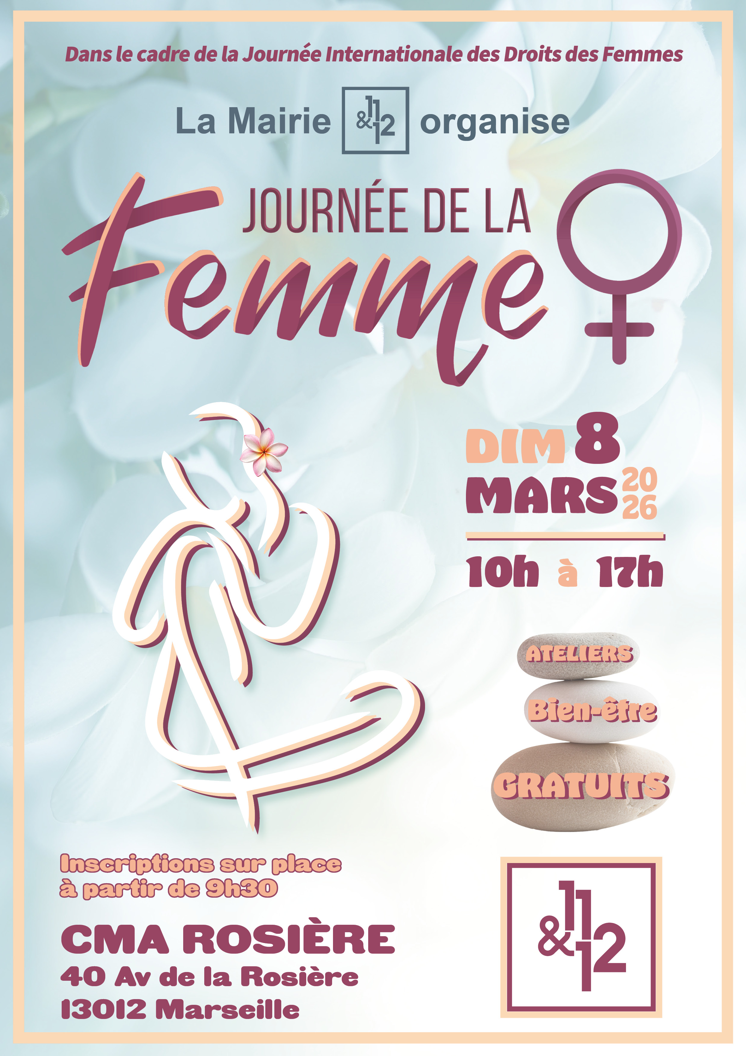 Dans le cadre de la journée internationale des droits des femmes, la Mairie des 11&12 organise des ateliers bien-être, détente et relaxation le dimanche 8 mars 2026 de 10h à 17h au CMA Rosière.